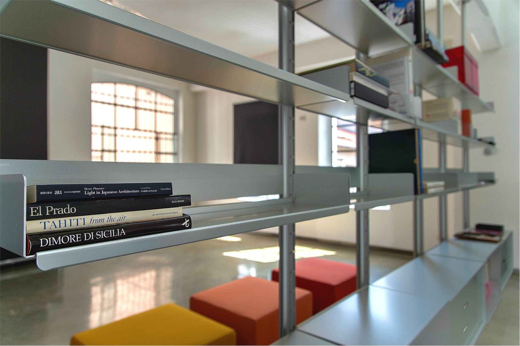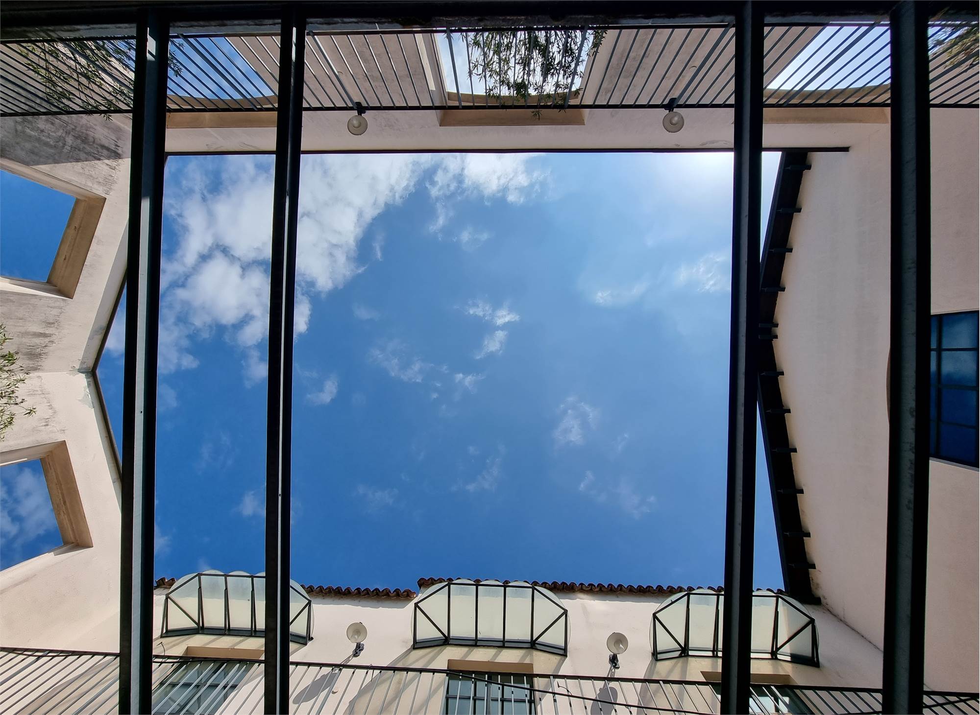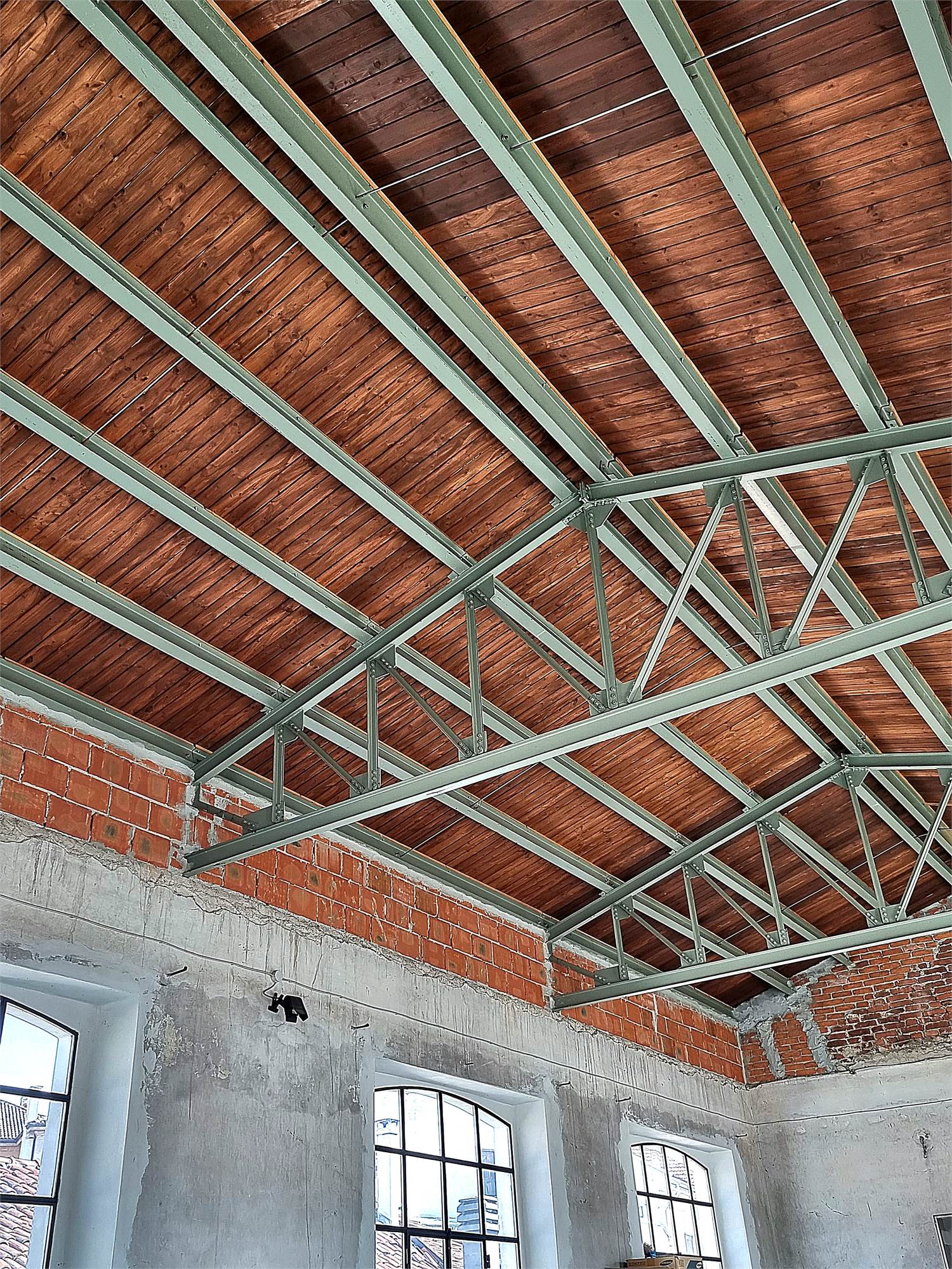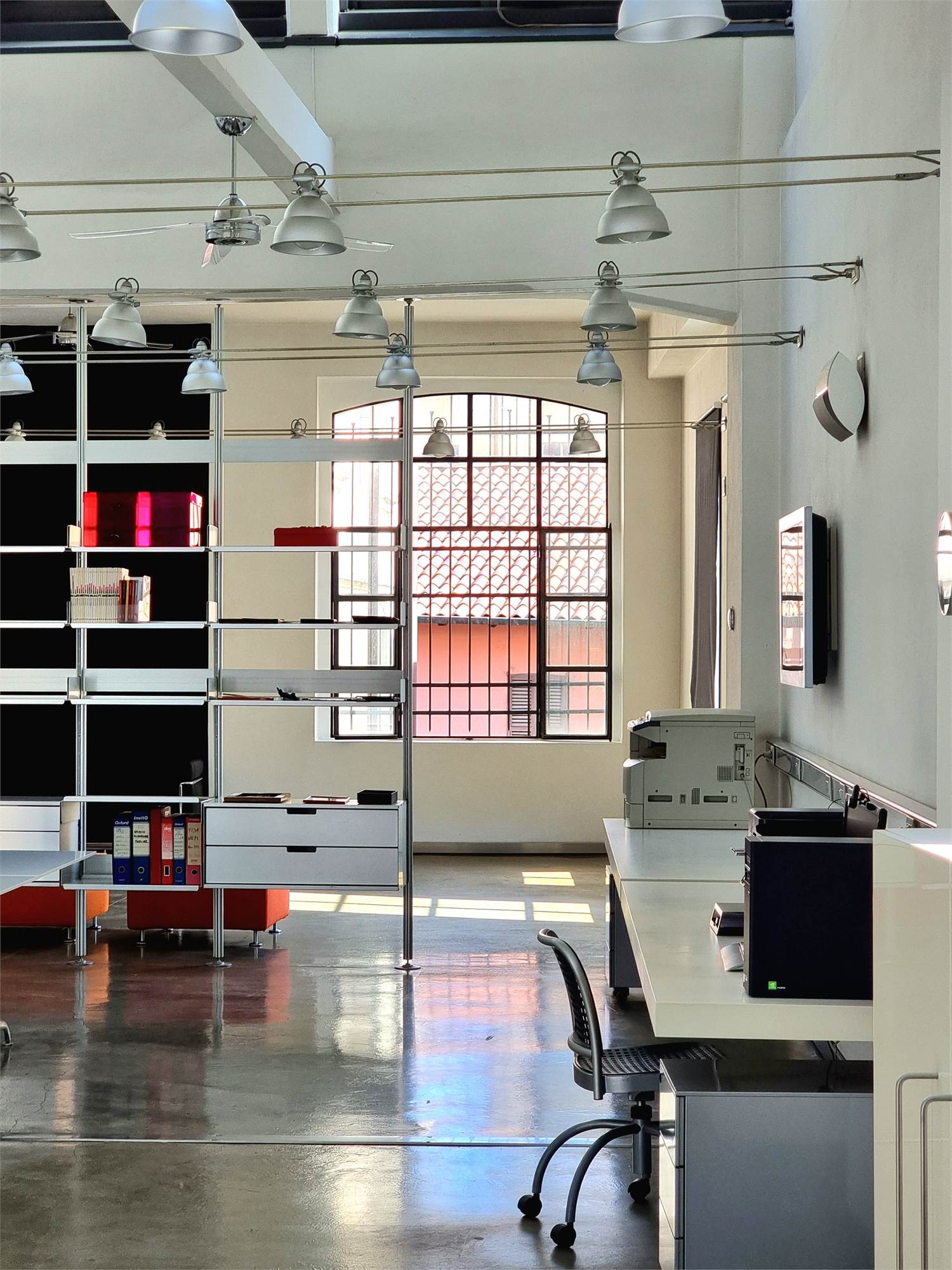 Il deposito, ancora da personalizzare a livello di suddivisione degli spazi, di finiture e diramazione dell'impiantistica, con i suoi 150 mq di superficie e un'altezza di 5mt con tetto a spiovente e doppia esposizione, permette facilmente di reinterpretare la zona notte, sfruttando le altezze e realizzando camere da letto e zone hobby anche soppalcate, per giocare con questi ampi volumi. Entrambi i corpi di fabbrica affacciano su una balconata disposta come una sorta di chiostro che guarda, verso il basso, sul cortile comune interno e all'orizzonte sui tetti della città.