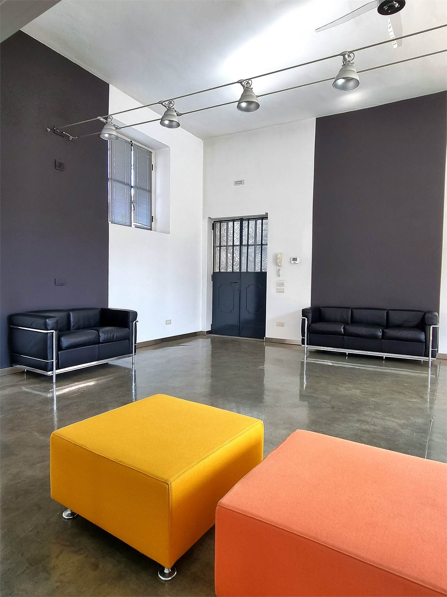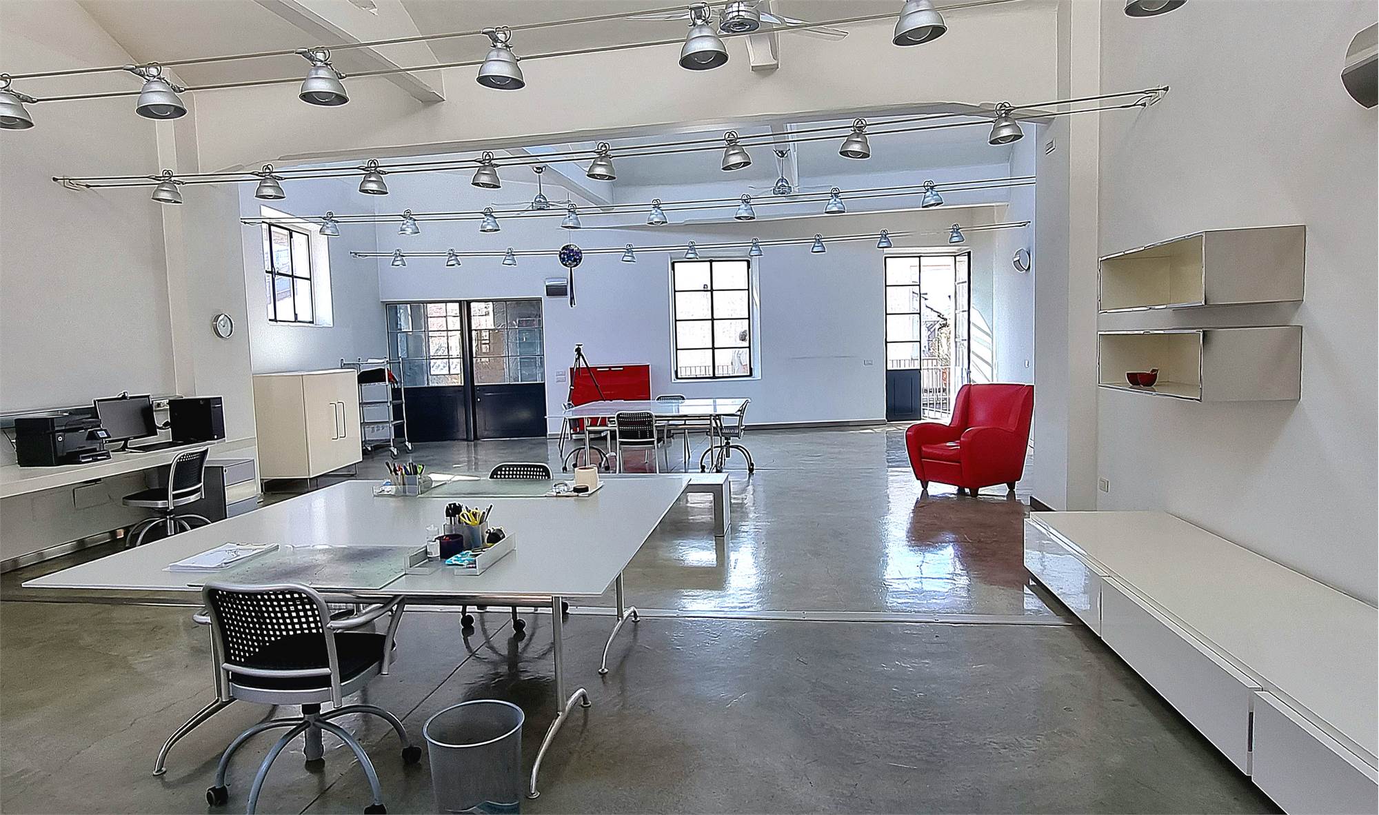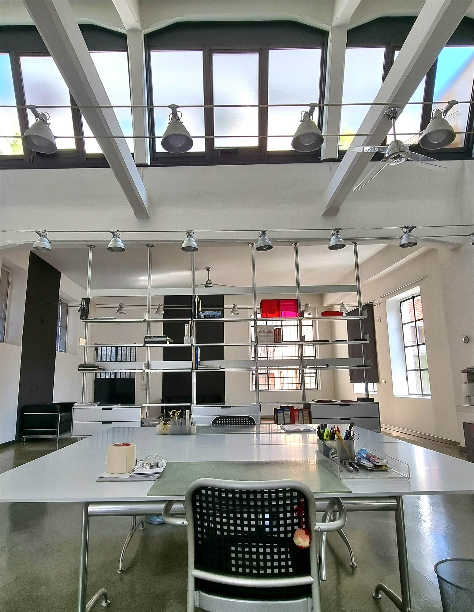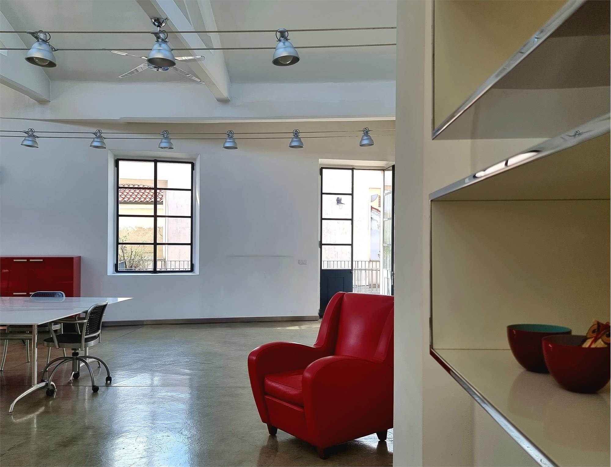 L'accesso all'abitazione avviene dall'attuale modelleria, un ambiente open space caratterizzato da ampie vetrate in ferro di stampo industriale, dislocate lungo la doppia esposizione e dalla copertura a shed: la luce diventa il primo grande elemento di arredo di questo spazio, facilmente reinterpretabile come zona living e in cui dare forma alla cucina, alla zona pranzo, alla conversazione/relax. Ben 22o mq, in cui sono già inseriti due locali adiacenti uno adibito a servizio igienico e uno ad ufficio, dalla pavimentazione omogenea in resina cementizia color cenere che celano il riscaldamento radiante già presente.