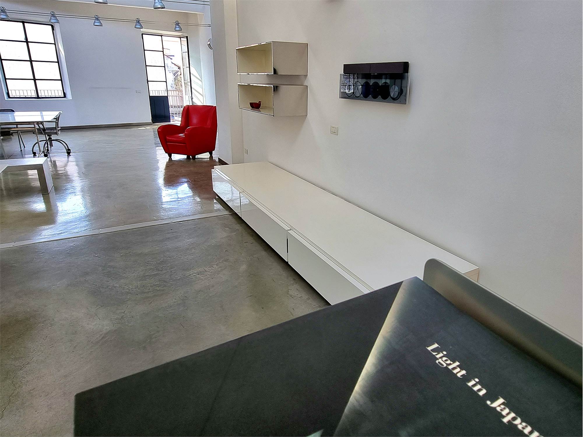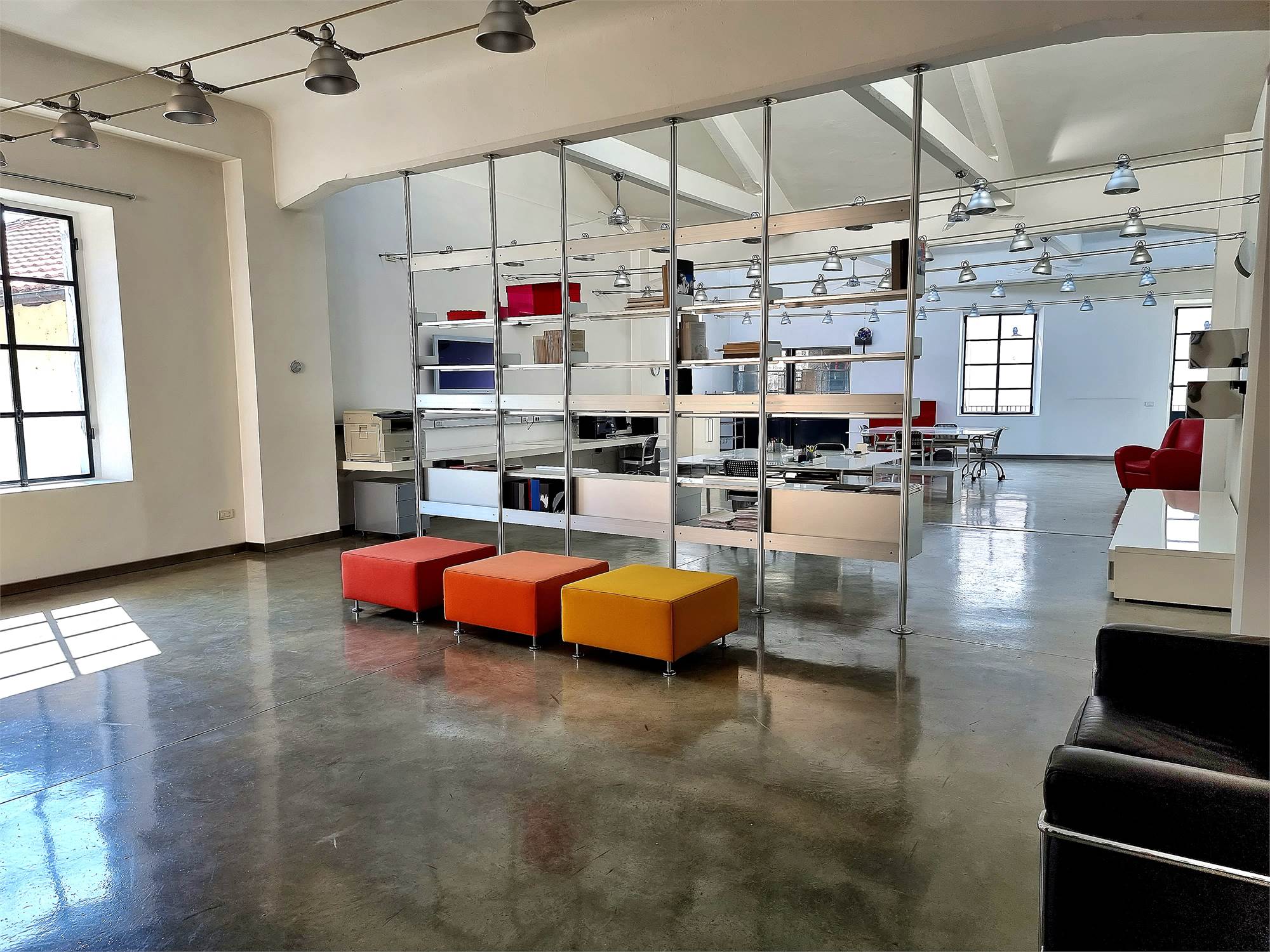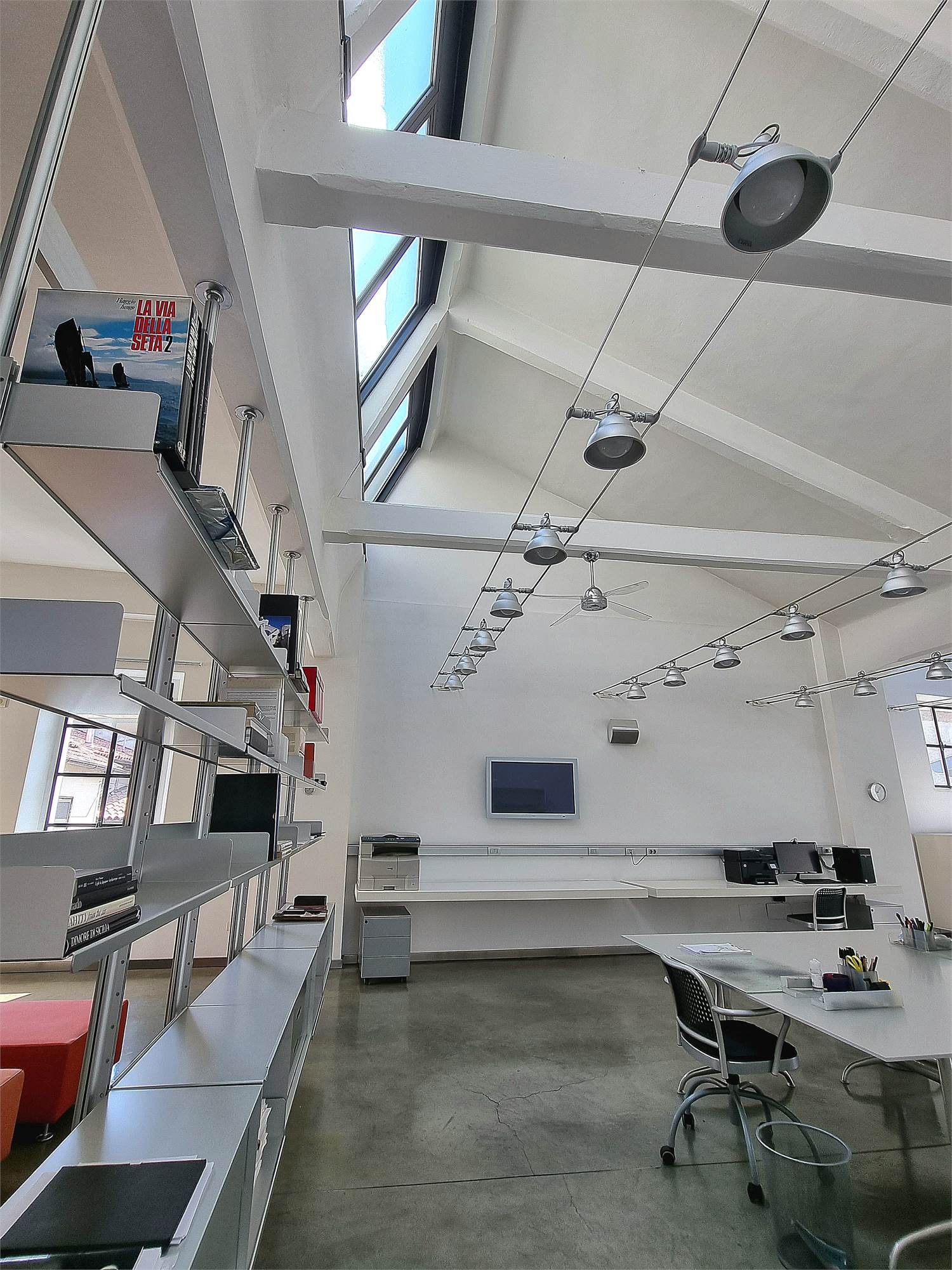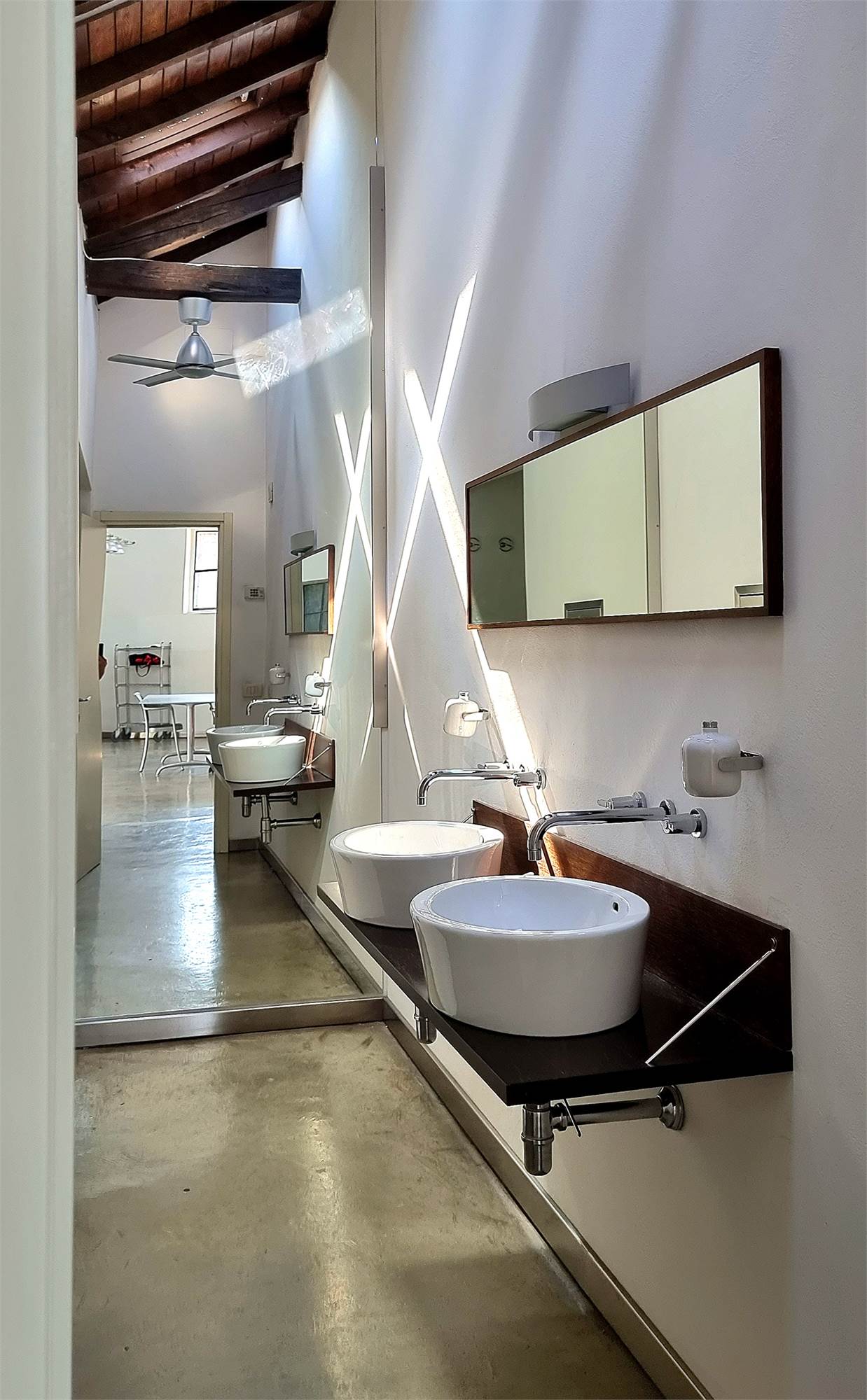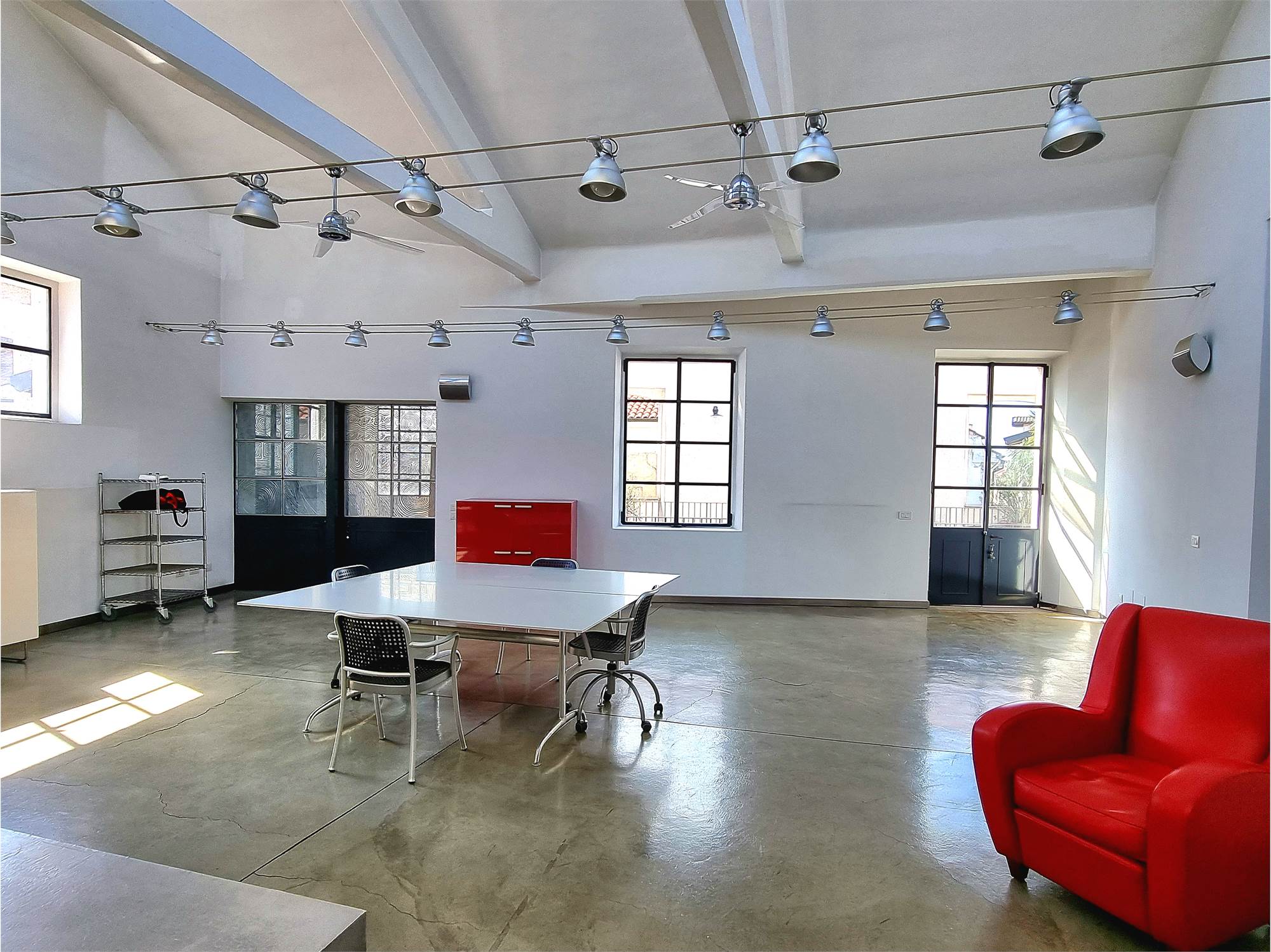 L'accesso all'abitazione avviene dall'attuale modelleria, un ambiente open space caratterizzato da ampie vetrate in ferro di stampo industriale, dislocate lungo la doppia esposizione e dalla copertura a shed: la luce diventa il primo grande elemento di arredo di questo spazio, facilmente reinterpretabile come zona living e in cui dare forma alla cucina, alla zona pranzo, alla conversazione/relax. Ben 22o mq, in cui sono già inseriti due locali adiacenti uno adibito a servizio igienico e uno ad ufficio, dalla pavimentazione omogenea in resina cementizia color cenere che celano il riscaldamento radiante già presente.